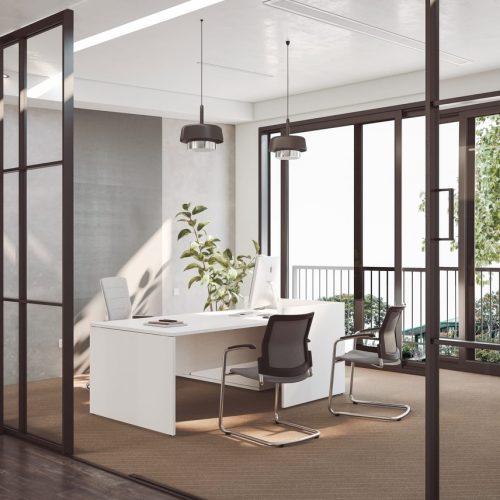 El sistema de alas Prisma permite apoyar una terminación en “L” sobre más patas cuadradas o sobre bucks de archivo sin tapa superior. De esta forma se abre un abanico más amplio de posibilidades a la hora de crear espacios de trabajo más operativos y funcionales.